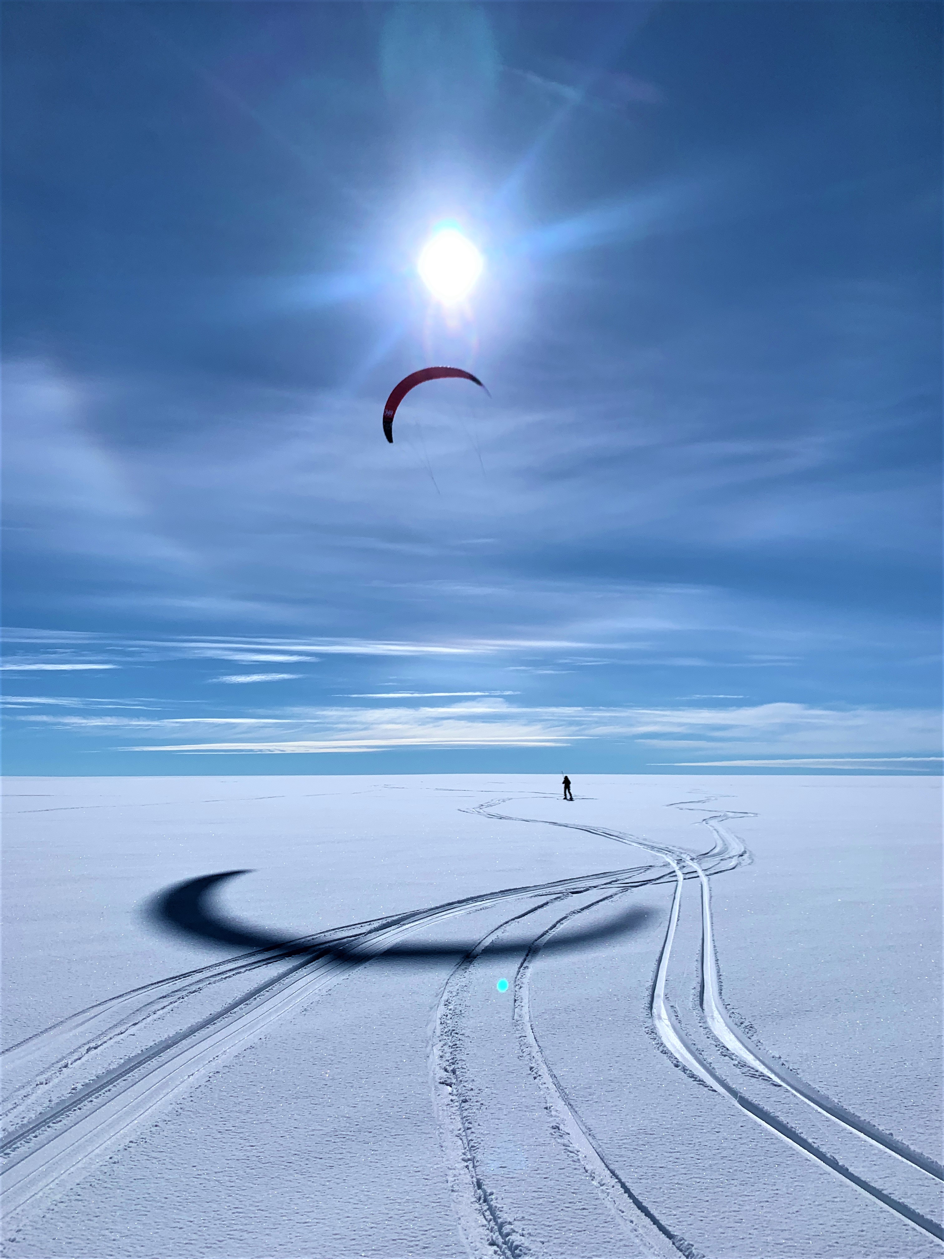 Led by our Polar Experience guide and snowkite expert Michael Charavin, we learn and perfect basic kite skiing techniques. We take the time to review skills such as how to open and launch the sail, how to manipulate and pull it in the wind, and how to tack in the breeze. You organically progress in kite skiing while controlling your speed while coping with the meteorological constraints of the environment.